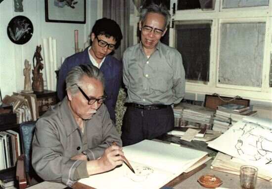 ■1983年5月,梁江陪廖冰兄(右一)拜访叶浅予。