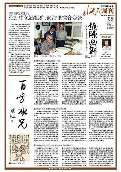 梁江:记起第一次去拜访冰兄,是一个暑热的夏夜。一进门,看到简陋的客厅里已挤坐了多个美院的青年学生,冰兄大声地讲,学生静静地听。那时,我第一眼感到特别的,是他凸现在头发花白、骨骼分明脸庞上的一双眼睛,如此锋利,同时又如此的明澈。