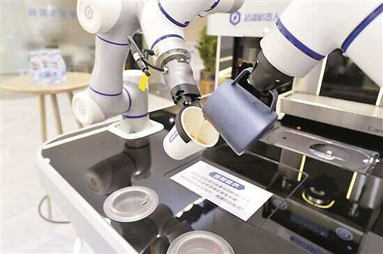 在广东深圳越疆科技有限公司,机器人制作咖啡拉花。新华社发
