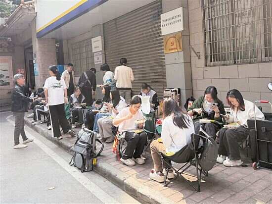 根据时间安排,开考首日14时30分开始考速写,由于要提前进场准备,当天的午休时间并不充裕。为解决考生们的午餐问题,有画室老师将快餐带到了考场附近,指引考生有序领取午餐。考生们在考点附近的小道里三三两两聚在一起,有的打开便携椅,有的直接席地而坐,一边吃午餐一边讨论着考题。考生朱同学告诉新快报记者,当天考的素描题目是一名方圆脸的男青年人像。“还考了从右边来的微弱光,”她身边的同学补充道:“明暗交界线不是特别清晰。”被问及考题会不会太难时,她们都摇摇头,表示难度适中,“我们从7月开始集训,平常练习也会画到类似的人像。”记者留意到,考生们为了让长时间的作画过程更舒适,有的会穿宽松的长裤,还有的穿上了拖鞋。“也是暗示自己心态放松一些吧,我觉得只需要尽力而为就好,压力太大反而会有反效果。”朱同学说。