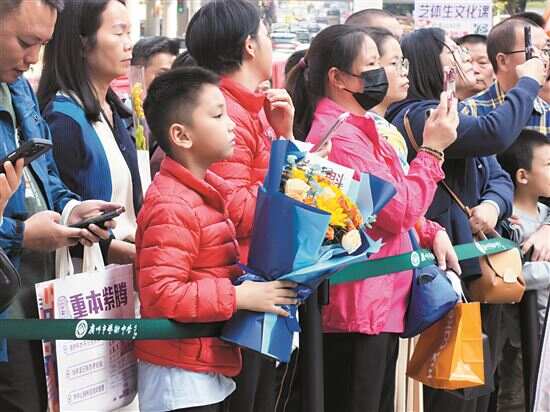 12月7日,最后一科色彩考试结束后,广州市艺术中学考点前,家长们自发排起长队,让出考生通道。沿路可看到,不少家长手中捧着鲜花翘首以盼着孩子的身影。有家长自制手工向日葵花束,希望孩子能够“一举夺魁”。