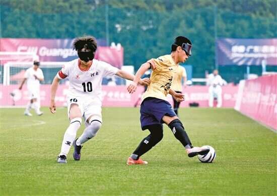■12月10日,残特奥会盲人足球项目男子组小组赛在广州大学城足球场进行。广东一队7∶0大胜河南队。新快报记者 观显锋/摄