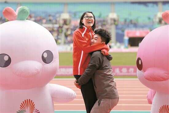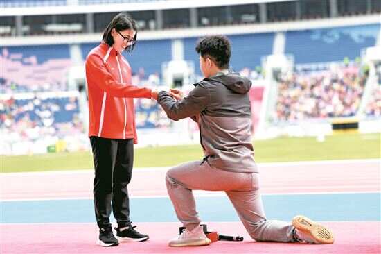 ■湖南队的李东阳向湖南田径运动员史逸婷求婚。 新快报记者 观显锋/摄