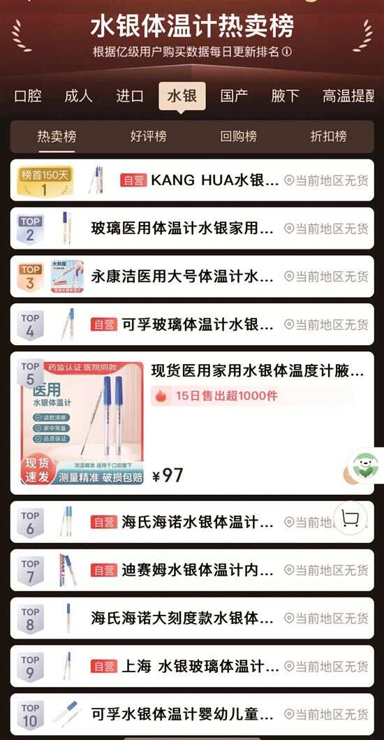 ■记者在某电商平台上定位广州市,查看水银体温计热卖榜,平台显示多款热销的水银体温计处于无货状态。