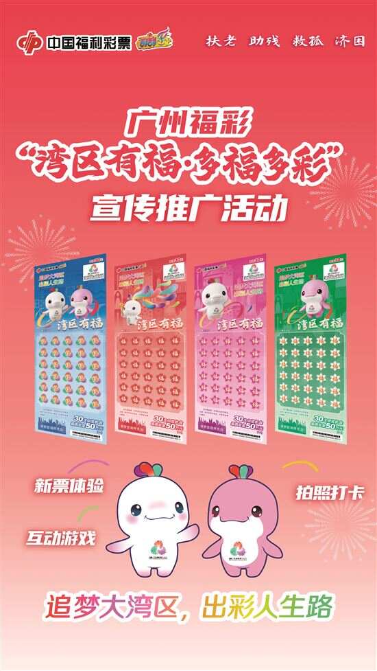 为回馈广大购彩者,广州市福利彩票发行中心还推出了“湾区有福 多福多彩”赠票营销活动,即日起在广州市福彩销售场所内购买“湾区有福”即开型福利彩票,单张彩票中得50元奖级或40元奖级的,除获得票面奖金外,可获赠20元任意票种的即开型福利彩票。