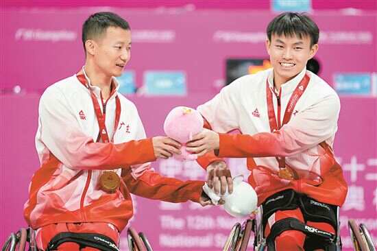 12月15日,在轮椅篮球项目冠军领奖台上,广东队球员林银海(左)和王正权交换吉祥物玩偶。新华社发
