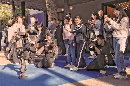 ■会场外的迎宾机器人吸引与会嘉宾驻足拍照。