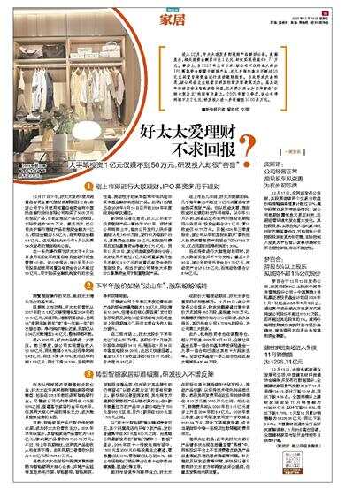 12月17日下午,好太太发布《使用闲置自有资金委托理财到期赎回》公告,称该公司于9月使用闲置自有资金向中国民生银行股份有限公司购买了5000万元的理财产品,目前该理财产品已经赎回,实际收益为26.71万元。截至当天,该公司关于银行理财产品的理财金额为7亿元,赎回金额为5.5亿元,尚未赎回金额1.5亿元。这已是好太太今年1月以来第14次发布的理财相关公告。