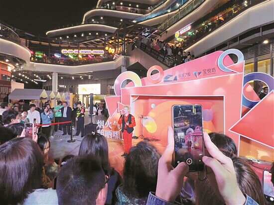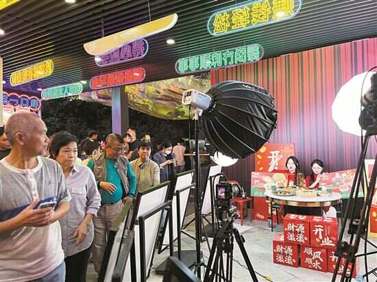漫步宝悦坊内,“烟火气翻嗮黎”宣传标语随处可见。再加上一排排商家食肆前写着“开工大吉”的花篮,墙上天花板上悬挂各类饮食招牌,甚至还有直接设在连廊边的美食直播间,这些营销符号仿佛都在告诉广大街坊食客,这里正在努力构建一个热闹的市井消费场景。
