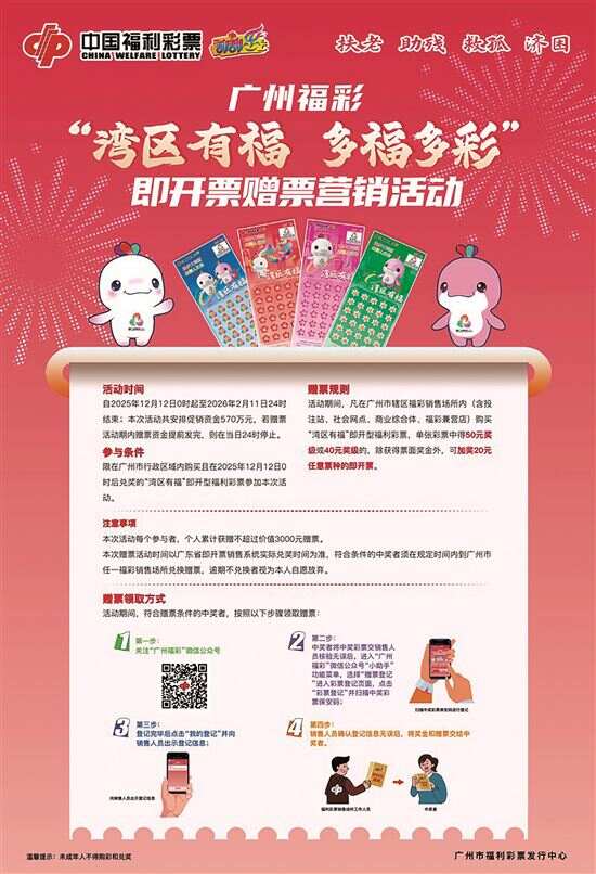 在广州市福彩销售场所内购买且在2025年12月12日0时后兑奖的“湾区有福”即开型福利彩票,即可参加本次活动。