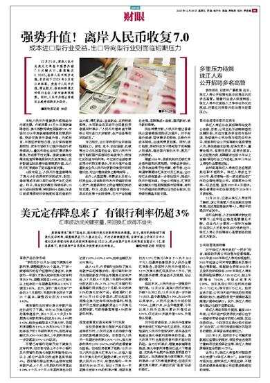 美联储降息“靴子”落地后,国内银行美元存款利率迎来调整。近日,银行机构陆续下调美元定存利率,调整幅度在25个基点左右。不过记者梳理发现,当前市场上仍有不少中小银行及外资银行的美元存款利率维持在3%以上,部分短期产品年化利率甚至高达4.5%,高息诱惑下,美元理财产品再度成为投资者关注的焦点。