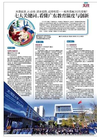 2025年已落幕,广东教育在这一年涌现出了哪些新变化、新亮点?学前教育免费政策逐步推进,百万家庭享受到育儿福利,育儿负担得到切实减轻;广东在全国率先出台省级人工智能教育落地方案,让AI教育在南粤课堂实现“有目标可依、有课程可用、有教师可教”;从大中小学生同上一堂思政大课,到打造新时代思政金课;从大湾区大学正式落地、本科教育扩容持续推进,到职业本科院校密集增设、精准对接低空经济等新兴领域需求,广东高校在整体布局、学科建设与人才培养等方面实现全新突破,彰显出以“扩容、提质、创新”为脉络的系统性变革……让我们一同回顾广东教育2025年的关键词。