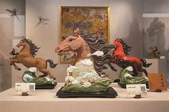 此次展览共汇集六个品类十一种工艺的近百件精品力作,从玉雕的金声玉振到陶瓷的窑变天成,从刺绣的丝光流转到漆器的层叠蕴彩,匠人们以手追心,借不同材质塑马之筋骨,染马之神采。每一件作品,皆在形制、色彩与肌理中,融汇古法之严谨与今意之灵动,方寸之间,自有山河奔涌之势。展览以“匠艺、美学”为脉络,构筑双重意境的沉浸空间。移步换景,可见金属锻铸的铮铮骏骨,亦可触缂丝细织的鬃风飘逸,木雕的凹凸有致,玉雕的光影流转。展览以空间为画卷,将器物置于虚实相生的情境中,使观者不仅“观看”,更能“游历”——在器与物的交织中,感受马之精神与匠之心语的共鸣。(梁志钦)