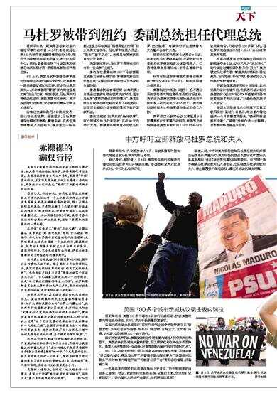 图穷匕见,不过如此。如果说美军在众目睽睽之下明火执仗地对一个主权国家使用武力并掳走其国家元首是赤裸裸的霸权行径,那么美国总统随后的表态,更是彻底撕下了之前所谓“打击毒品恐怖主义”的虚伪面具,将资源帝国主义真实面目暴露无遗。正如英国《卫报》所说,美国对委内瑞拉的行动类似伊拉克战争,延续了其攫取他国资源的一贯套路。