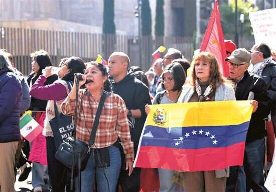 ■1月3日,在墨西哥首都墨西哥城美国驻墨西哥使馆外,当地民众手持委内瑞拉国旗参加抗议活动。