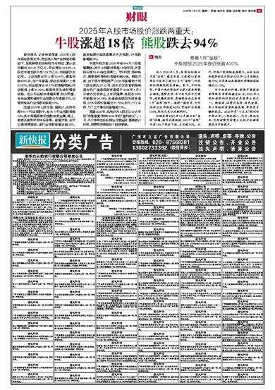 新快报讯 记者涂波报道 2025年A股市场在政策支持、资金流入和产业转型的驱动下,呈现鲜明的结构性牛市特征,累计成交额达420.21万亿元,同比增长62.64%,A股总市值也跃升至109万亿元,均刷新历史纪录。上证指数全年上涨18.41%,最高突破4000点,创十年新高;深证成指累计上涨29.87%,创业板指以49.57%的涨幅领跑;科创板指上涨35.92%,彰显科技主线的强劲动能。但从行业板块涨幅来看,冰火两重,有色金属和通信行业指数全年涨超80%,白酒和食品行业指数均跌超10%。