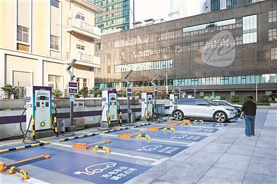 ▲天河区珠江新城一处充电站,新能源汽车在充电。