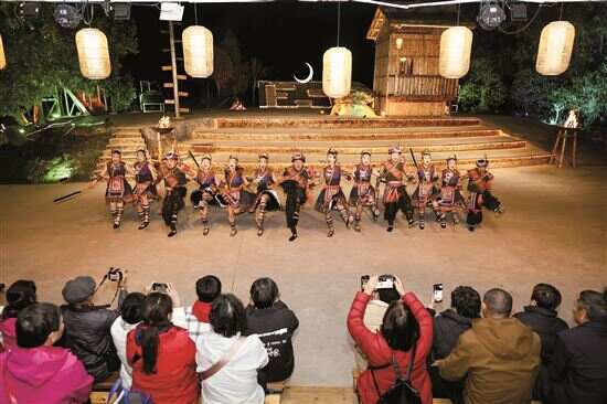 ■金秀瑶族自治县金秀镇金田村社村屯瑶王寨,游客欣赏大型实景演出《忆·瑶山》。
