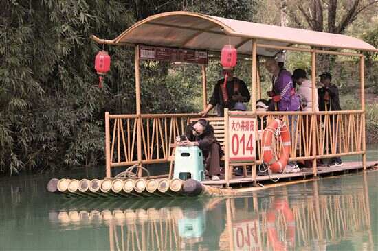 ■大小井景区里,人们坐在电动竹艇上游玩。