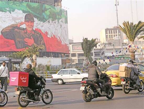 ■1月6日,在伊朗首都德黑兰街头,车辆经过一幅绘有伊遇袭身亡的高级将领卡西姆·苏莱曼尼形象的宣传海报。新华社发