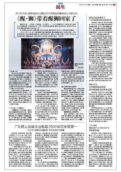 1月10日至11日,由广州歌舞剧院创排的舞剧《醒·狮》在醒狮起源地广东佛山巡演。18名男演员舞起9头威风凛凛的醒狮,站上鼓面向前迈进。霎时,灯光熄灭,舞台上出现了用竹片龙骨架搭建的巨型醒狮造型,它睁开双眼,目光如炬,全场掌声雷动、一片惊呼。