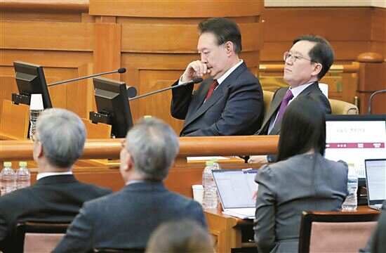 ■这是2025年2月20日尹锡悦(中)在韩国首尔宪法法院出席总统弹劾案庭审的资料照片。新华社发