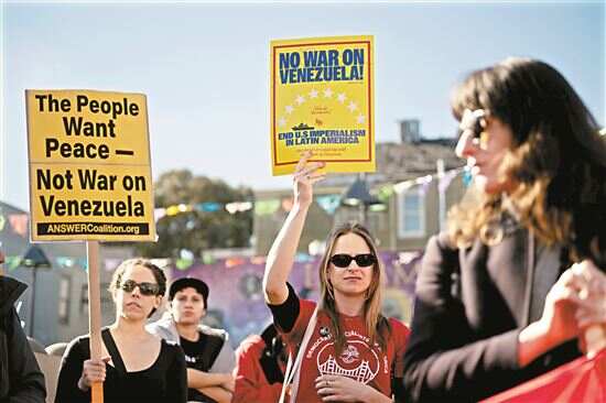 ■1月10日,在美国加利福尼亚州旧金山,两名女子手持标语参加活动,抗议美国对委内瑞拉的军事行动。新华社发