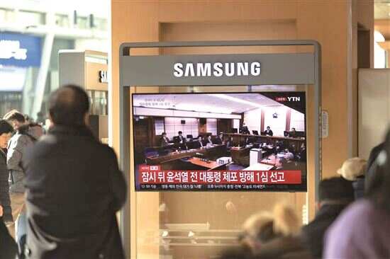 ■1月16日,在韩国首尔火车站,民众观看尹锡悦的庭审新闻。新华社发