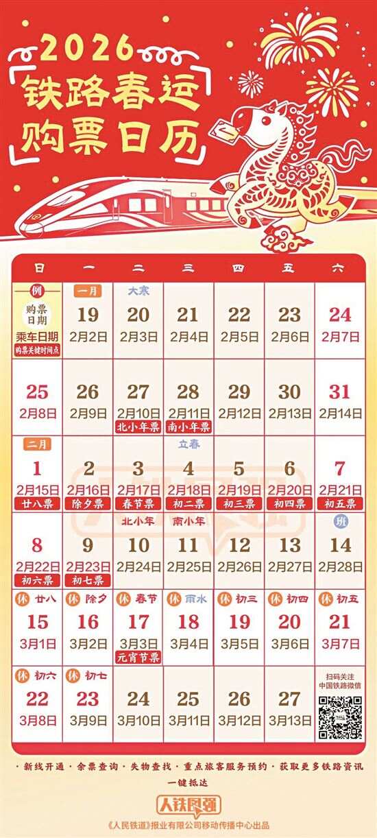 记者1月18日从国铁集团获悉,2026年铁路春运自2月2日开始,到3月13日结束,为期40天,全国铁路预计发送旅客5.39亿人次、同比增长5.0%,节前客流高峰日预计为2月13日(年廿六),节后客流高峰日预计为2月23日(正月初七)。铁路12306平台1月19日起还推出了旅客误购限时免费退票服务。