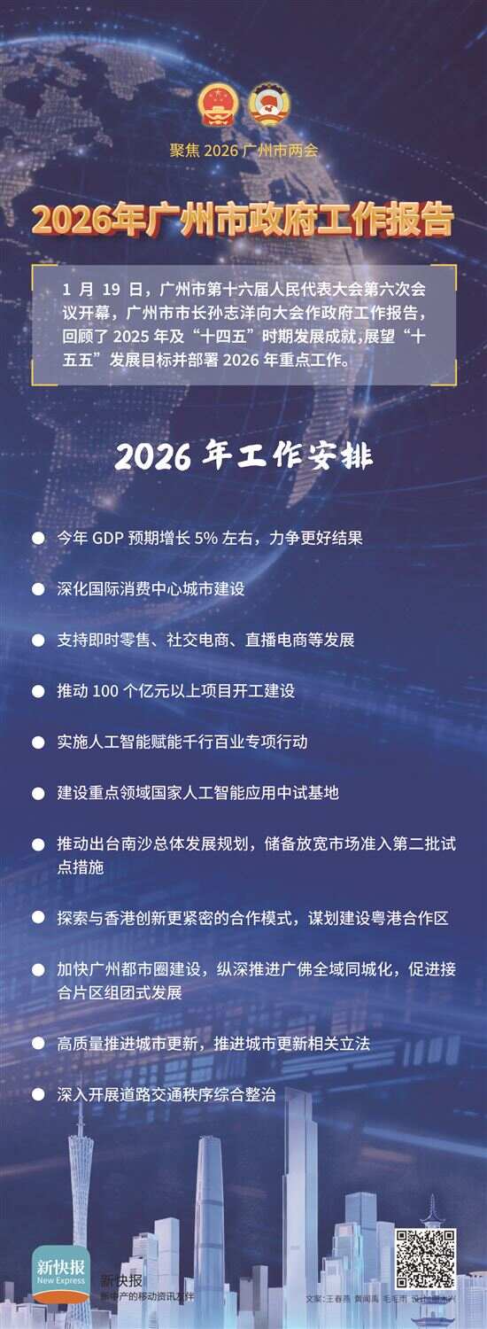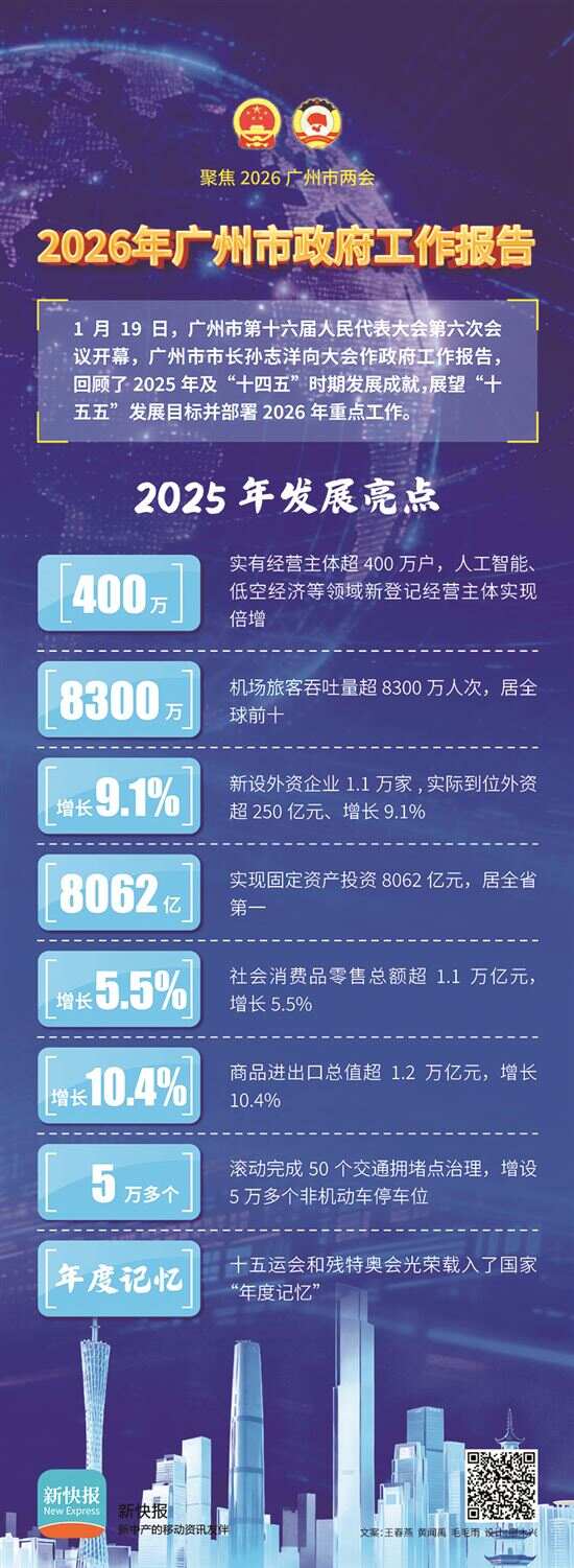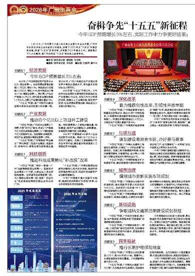 1月19日,广州市第十六届人民代表大会第六次会议开幕,广州市市长孙志洋向大会作政府工作报告,回顾了2025年及“十四五”时期发展成就,展望“十五五”发展目标,并部署2026年重点工作。请跟随以下八大关键词,看广州如何在“十五五”新征程上奋楫争先。
