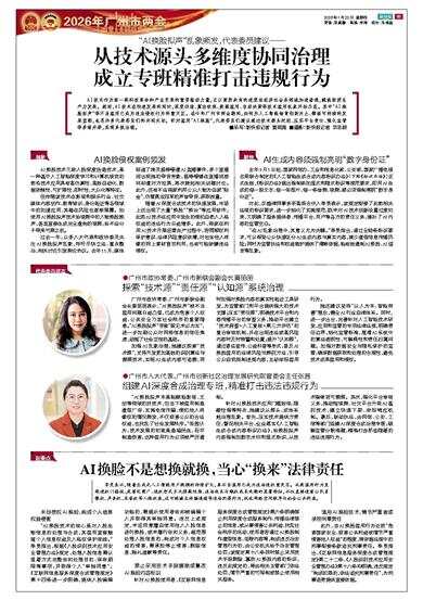 AI技术作为新一轮科技革命和产业变革的重要驱动力量,正以前所未有的速度向经济社会各领域加速渗透,赋能新质生产力发展。然而,AI技术在快速发展的同时,深度伪造、算法歧视、数据滥用、自动决策等技术滥用乱象开始凸显。其中“AI换脸拟声”等不当滥用已成为违法侵权行为的重灾区。在今年广州市两会期间,如何为人工智能培育创新沃土、擘画可持续的发展蓝图,也是许多代表委员们的共同关切。针对滥用“AI换脸”,代表委员们建议通过技术源头把控、压实平台责任、强化监管等多措并举,实现系统治理。