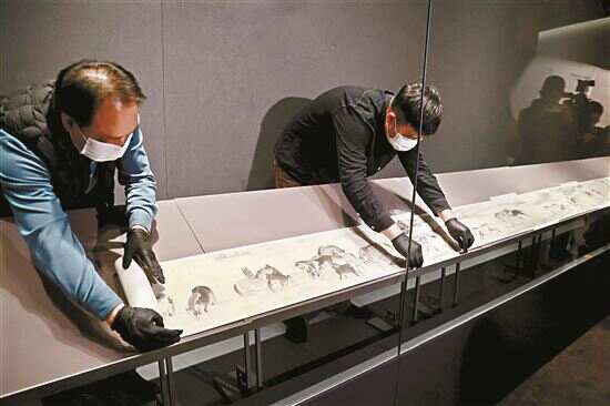 明代广东籍画家张穆的《七十龙媒图》是国家一级文物,长卷纵25.2厘米,横长10米,此卷创作于康熙二十一年(1682年),是张穆七十四岁高龄时应“公叔世兄”之请所绘,也是他传世所有马主题作品里,年代最晚、最为成熟的一件珍品。画卷描绘七十匹骏马,姿态无一雷同,或奔跑,或翻滚,或嘶鸣,以笔墨生动捕捉骏马在天地间的各种动态。由容庚先生捐赠的这卷《七十龙媒图》也是艺博院的“镇院之宝”之一。