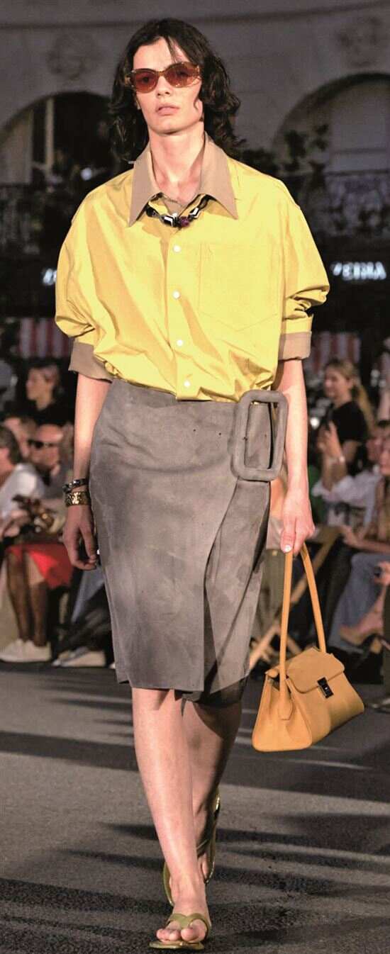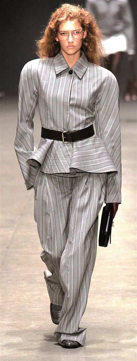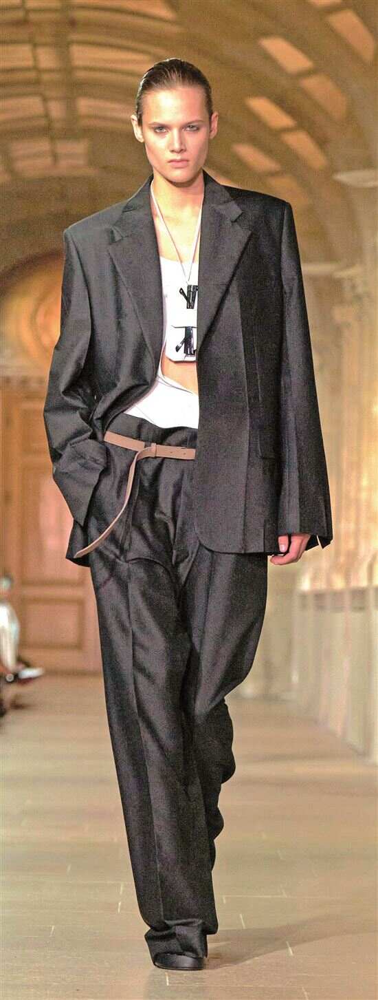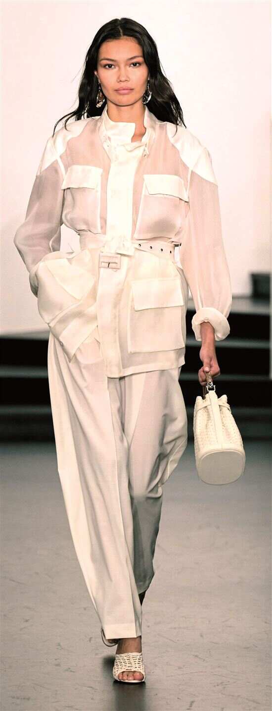 宽肩依然是核心元素,不过摒弃了过往的厚重垫肩而改用轻薄软质垫肩,搭配垂感面料的西装外套,既能修饰头身比又不会显强势压抑。