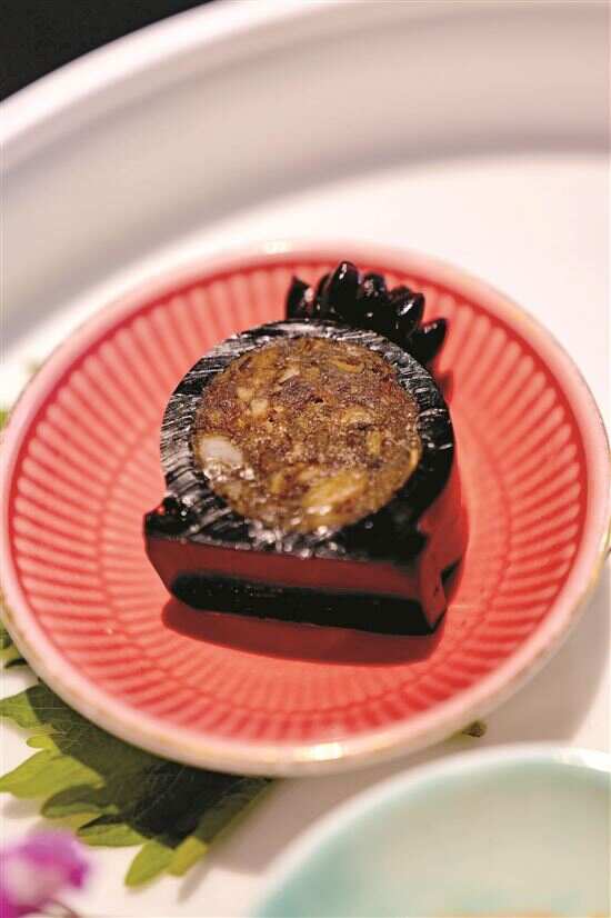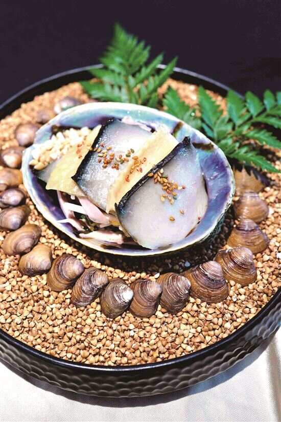 ■新西兰黑金鲍捞起脆皮竹虫鸡,顺德捞起的做法,黑金鲍低温慢烹数小时,搭配爽脆鸡皮非常合拍。