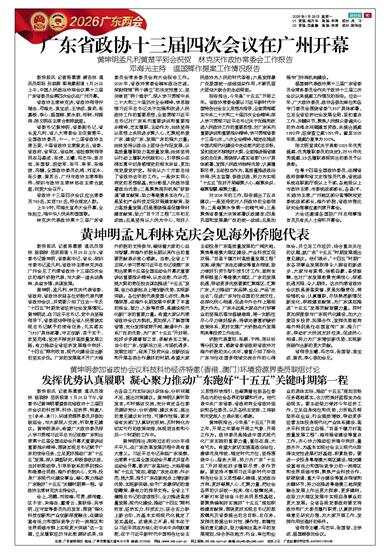 黄坤明指出,刚刚过去的2025年很不平凡,在广东改革发展历程中具有重大意义。习近平总书记亲临广东视察,出席第十五届全国运动会开幕式并宣布运动会开幕,要求广东高站位、大格局编制“十五五”规划,寄望广东走在前、作示范、挑大梁,指引广东在新起点上增创新优势、实现新突破,给予广东最深切的激励鞭策、最有力的指导支持。全省上下遵循总书记的谆谆指引,全力推进高质量发展、现代化建设,推动“十四五”顺利收官,经济实力、科技实力、综合实力跃上新台阶,为基本实现现代化奠定了坚实基础。成绩来之不易,根本在于以习近平同志为核心的中共中央领航掌舵,在于习近平新时代中国特色社会主义思想科学指引,也凝聚着包括各位委员在内的社会各界的智慧和汗水。他代表中共广东省委、省政府向全省政协组织和各位委员,以及各民主党派、工商联和无党派人士表示衷心感谢。