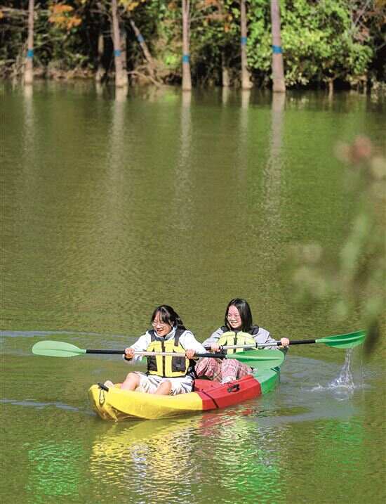 在游船基地,一家公司几十名职工按两人一组,坐上皮划艇比赛,在运动中充分放松心情,又增进了感情。新快报记者了解到,天人山水旅游度假区已获得“国家体育旅游示范基地”称号,在这里,水上桨板、水上卡丁车、水上自行车、皮划艇、溯溪、丛林穿越、山道滑车、越野、山地马拉松、彩虹滑道等运动项目,让人们过足瘾。