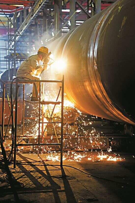 ■施工人员焊接海上换流站导管架。 陈志军/摄