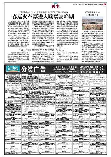 新快报讯 记者许力夫 通讯员董剑锋 黄瑜楚报道 春运火车票已经进入购票高峰期。记者从国铁广州局获悉,1月27日可买2月10日火车票,28日开售2月11日的火车票。铁路部门预计,1月27日和28日是第一波购票高峰,之后两个高峰日是1月30日和2月1日,分别开售2月13日年廿六和2月15日年廿八(除夕前一天)的火车票。