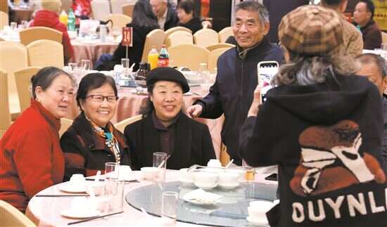 ■2025年团年饭上,领导嘉宾手持福字向大家拜年;老朋友们聚在一起欢乐合影。新快报记者 王飞(资料图片)