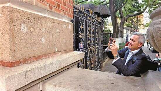 ■伯捷后人拍摄位于沙面“红楼”粤海关俱乐部奠基石上“治平洋行”的字样,粤海关俱乐部是沙面建筑群最标志性的建筑之一,1906年由治平洋行设计并施工建造。