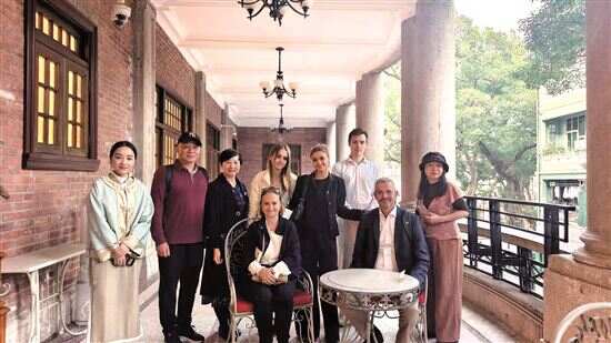 ■伯捷后人与《我的故乡在中国》作者海娆(右一)、南越王博物院研究馆员潘剑芬(左三)及原广州市荔湾区人大常委会教科文卫工委主任梁东(左二)在有着“沙面第一楼”之称的东方汇理银行旧址前合影。