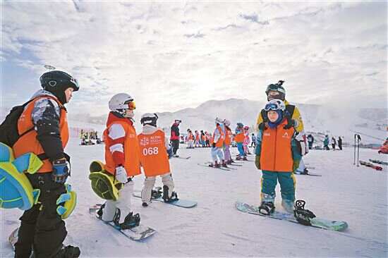 ■学生在阿勒泰将军山国际滑雪度假区学习滑雪技巧。新华社发