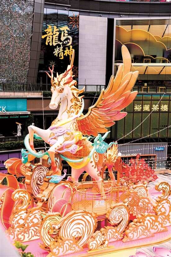 无独有偶,天环Parc Central以“龙马精神”为主题的新春特展在社交平台掀起刷屏潮。10.88米高的巨型古代神话瑞兽“龙马”伫立在户外广场,其全身铺贴1.2万片24K金箔,饰以168块熠熠龙鳞,寓意“十全十美”“一路发”,装置还巧妙融入广州木棉花图腾及卷草、祥云等传统纹样,尽显广府特色。“我们希望通过艺术装置,为市民创造一个有记忆点的春节体验。”天环相关负责人表示。