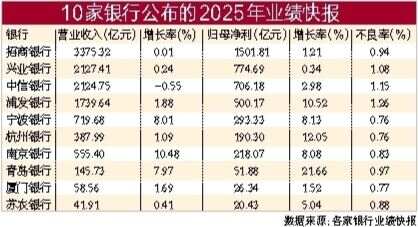 目前已披露2025年度业绩快报的10家银行分别为招商银行、中信银行、兴业银行、浦发银行、宁波银行、南京银行、杭州银行、青岛银行、厦门银行、苏农银行。