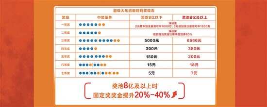 新规则下,最值得购彩者关注的是,当奖池滚存资金在8亿元及以上时,超级大乐透固定奖奖金将全面升级:三等奖单注奖金由5000元涨至6666元,提升约33%;四等奖单注奖金由300元涨至380元,提升约27%;五等奖单注奖金由150元涨至200元,提升约33%;六等奖单注奖金由15元涨至18元,提升20%;七等奖单注奖金由5元涨至7元,提升40%。
