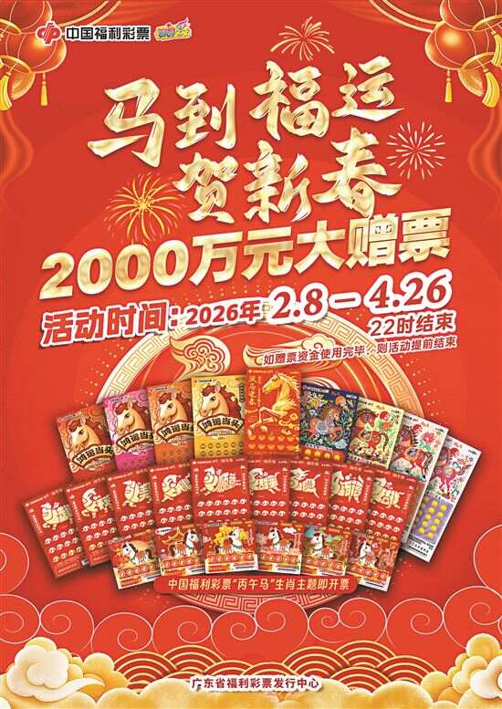 新快报讯 记者陆妍思 通讯员粤曹欣然报道 金马报喜,福彩送福。为弘扬春节文化,传递美好祝福,广东省福利彩票发行中心将自2026年2月8日0时至4月26日22时在全省范围(不含深圳)开展“马到福运贺新春”赠票营销活动。本次活动共安排2000万元赠票资金,如活动期间赠票资金提前使用完毕,则活动结束,广东省福利彩票发行中心将向社会发布活动结束公告。