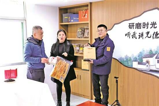 ■驻光德镇工作队队长肖伟峰(右一)在直播间介绍当地农特产品。