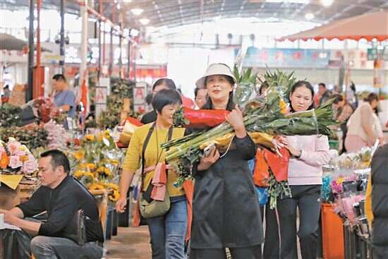 市场内,珠三角的不少花店商户正忙着补货。来自深圳一家花店的蔡先生说:“这里品种丰富,能实地挑选货品,像龙兰这类品质好的花卉都能找到,这是网上拿货或者去国内其他基地拿货比不了的。”