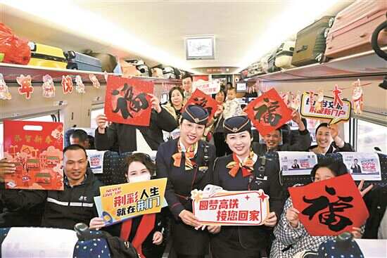 为缓解旅途疲惫,值乘本趟列车的广九客运段乘务人员还精心组织送福答题活动,围绕新春习俗、家乡发展等话题设置趣味题目,旅客们踊跃参与、争相举手,欢声笑语充盈着整个车厢。