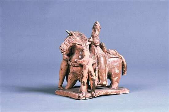 广州博物馆副研究员霍雨丰介绍,现藏广州博物馆的“青釉陶骑马俑”是出土于1981年广州沙河顶4号墓的文物。骑者头戴冠,双手握缰绳,端坐马鞍上。前有两个马僮牵马,后有一侍从,手里举一圆柄形物,疑为伞盖。骑马俑反映了晋代“广州人”的出行方式。